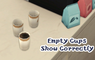 С дополнением "Любимое дело" наши персонажи получили возможность открыть кофейни, но некоторые моменты все же требовали доработки. Например, пустые чашки не отображались как пустые. Мод исправляет ошибку, из-за которой стаканы и чашки для напитков не становились пустыми после того, как персонаж их выпил.