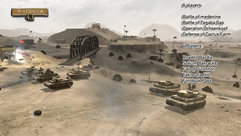 Кадр из карты «Дорога на Бардию», Ливия 1941 год. Формат карты 2х2.Кадр из карты «Оборона кактусовой фермы», Тунис 1943 год. Формат карты 3х3.Кадр из карты «Перевал Фондук», Тунис 1943 год. Формат карты 2х2.Кадр из карты «Бараки Соллум», Ливия 1941 год. Формат карты 2х2.Кадр из карты «Высота Такруна», Тунис 1943 год. Формат карты 2х2.Второй кадр из карты «Высота Такруна», Тунис 1943 год. Формат карты 2х2.Кадр из карты «Ущелье Тегаба», Тунис 1943 год. Формат карты 3х3.Полный список новых карт. «Наш картодел Sir_Leinad подготовил для вас 9 эксклюзивных карт пустыни. Они, разумеется, оптимизированы для PvP игр, но вы также можете играть против ботов на них, если захотите ;) »