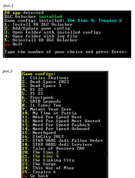 Товарищи! Почему не работают DLS ?Три распространённых причины: 1. В папке с игрой отсутствуют DLS 2. Рукожопая установка DLS 3. DLS не разблокированы.С первыми двумя причинами всё понятно, давайте рассмотрим третью. Для разблокировки DLS, скачиваем последнюю версию утилиты ― DLS Unlocker. (англ. длс разблокировщик)Открываем архив, достаем папку на рабочий стол, в папке находим файл с именем ― setup, кликаем и перед вами откроется окошко с командной строкой. Чтоб Unlocker смог разблочить ваши DLS, вам необходимо его инсталлировать, в верху должно отображаться зелёными буквами — installed (см. рис.1)Если в верху отображается красным — no installed, укажите в командной строке цифру — 1 и нажмите enter. Далее в командной строке укажите цифру — 2 enter, перед вами откроется следующее окно (см. рис.2) В этом окне вводим цифру — 21 enter, далее пишем буковку — q enter и этой командой закрываем окно.  Вуаля! Вы молодцы, Вы разблокировали ваши DLSки и игра их теперь будет видеть:) Но чтоб всё это получилось Вам нужно правильно без рукожопства перенести DLSки в корневую папку игры. Всем спасибо за внимание, всеем приятной игры и astalavista baby!