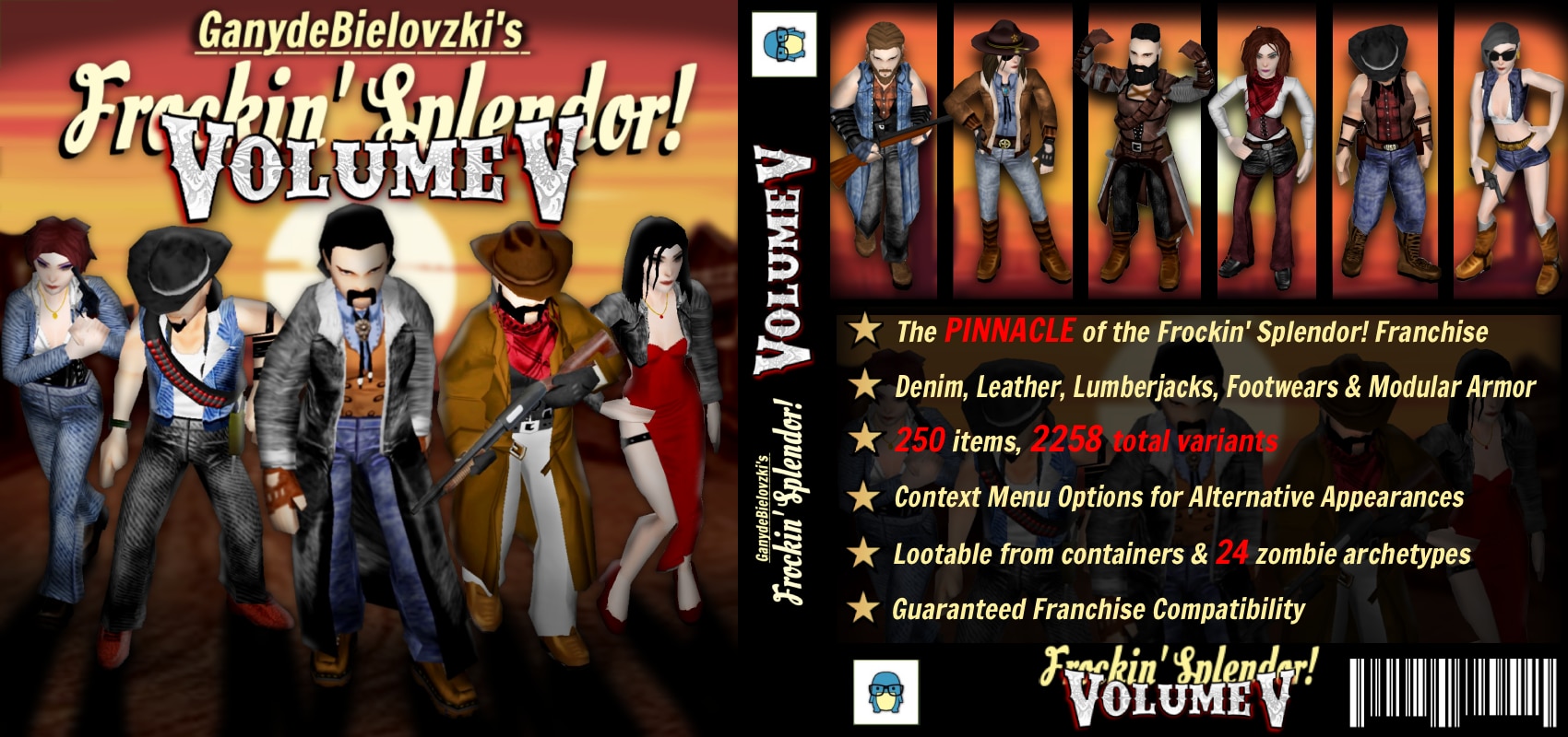 Мод [B42MP] Frockin’ Splendor! Vol.5 от автора GanydeBielovzki добавляет в Project Zomboid 250 новых элементов одежды и более 2200 визуальных вариантов на базе четырёх основных категорий: Flannel (фланель), Denim (джинсовая ткань), Tanned Leather (кожа) и Footwear (обувь).