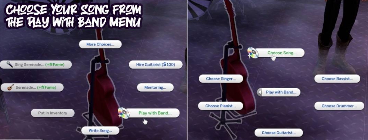 Как пользоваться: 1. Соберите своих коллег по группе и убедитесь, что все инструменты находятся рядом и активны в игре. 2. Наведите курсор на сима-гитариста и нажмите на любую гитару, чтобы открыть новое меню «Тренировка группы». 3. Выберите песню. 4. Вернитесь в меню и назначьте других участников группы на любой инструмент. Мод поддерживает несколько участников, например, двух вокалистов или трёх гитаристов. 5. Чтобы закончить игру, отмените взаимодействие с гитаристом. Все участники группы остановятся, как только закончатся их анимации.