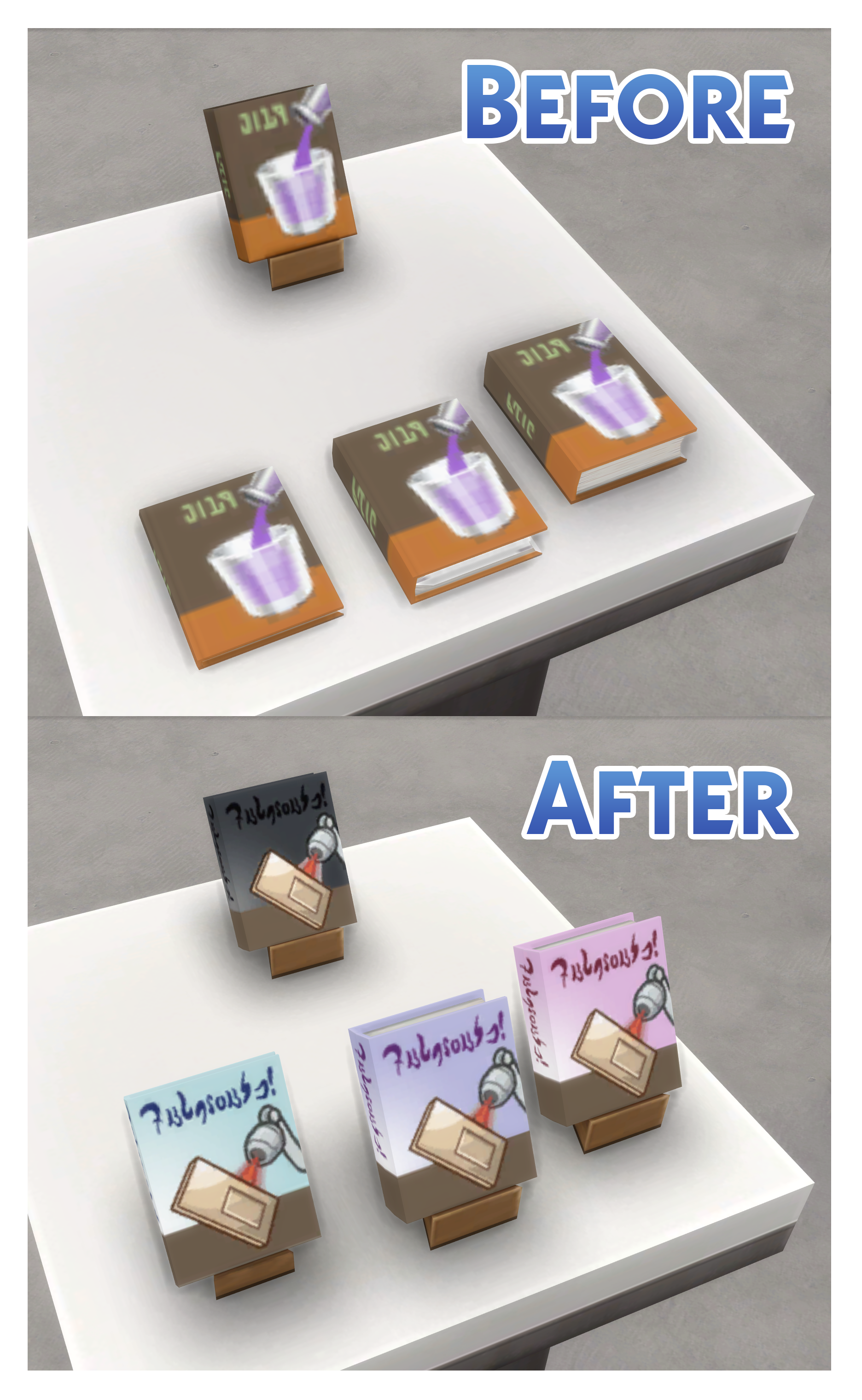 В стандартной игре книги для навыка производства из дополнения Eco Lifestyle выглядят странно. У них те же обложки, что и у книг для миксологии, что затрудняет их визуальное различение. Кроме того, при размещении на полках или витринах они не переключаются на режим отображения, как должны.