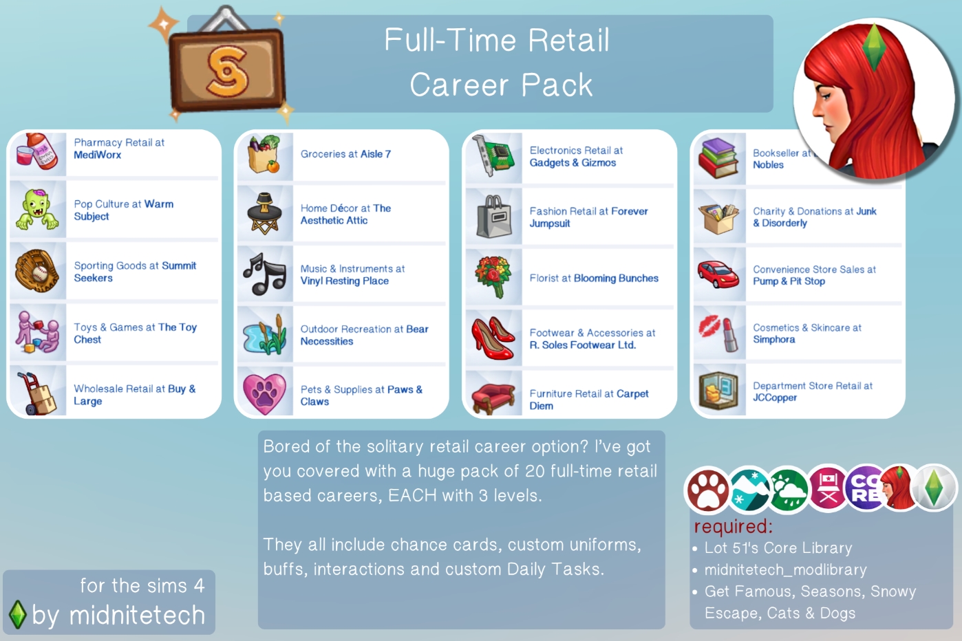 Мод добавляет в игру большой пакет карьер, связанных с розничной торговлей. Всего доступно 20 разных профессий, каждая из которых основана на отдельном типе магазина.