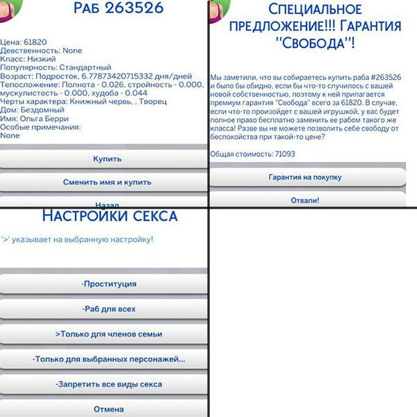 Это еще не все. В дополнение к нормальной системе проституции есть долговые рабы, которые функционируют немного по-другому. Чтобы сделать своего персонажа долговые рабом, у вас должно быть больше одной активной семьи. Перейдите в то же меню, в котором вы регистрировали проститутку и нажмите кнопку «Оформить долг». Затем появится пользовательский интерфейс, выберите персонажа, которого хотите сделать своим владельцем и введите размер долга от 0 до 9999999 симолеонов. Если вы введёте 0, то ваш персонаж не сможет погасить свой долг, потому что он будет бесконечным. От всего, что делает ваш персонаж, включая проституцию, его владелец получит 90% прибыли, а ему достанется только 10% (можно поменять это значение в настройках). Эти 90% пойдут на счёт владельца долгового раба и уменьшат сумму долга. После того, как долг будет погашен, персонаж перестанет быть долговым рабом и снова будет свободен. Кроме того, владелец может бесплатно заниматься сексом со своими долговым рабами. Долговые рабы не могу выбрать, какие услуги они будут принимать и предлагать и у них не проверяется уровень романтических отношений, как у обычных проституток. Стоит упомянуть и об этом. Обычные проститутки откажутся заниматься бесплатным сексом со всеми, кто не является членом их семьи и имеет менее 80-ти баллов романтическихотношений.Ведь как леди может зарабатывать себе на жизнь, если она раздаёт себя всем бесплатно? Кроме того, долговые рабы могут удалить свой номер телефона с сайта лишь на короткое время, потом он автоматически перерегистрируется. Долговые рабы не могут позволить себе долго сидеть без работы.