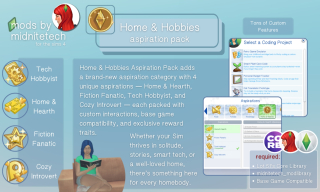 Home & Hobbies Aspiration Pack — это мод для The Sims 4, который добавляет новую категорию жизненных целей, сфокусированную на уюте, творчестве и повседневных радостях. В отличие от стандартных целей, связанных с карьерой, богатством или романтикой, этот мод предлагает творческие увлечения, домашние дела и саморазвитие. Вы сможете вести семейный очаг, писать, вести блог или заниматься программированием.