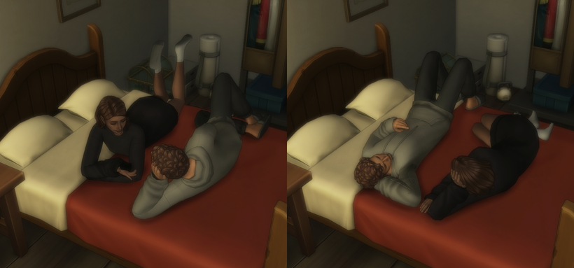 Мод добавляет новое взаимодействие, позволяющее поваляться и поболтать с избранным персонажем на двуспальной кровати. Анимация различается в зависимости от пола, однако ее можно изменить вручную с помощью мода Выбрать Стиль Анимаций в Модах от Simkatu.