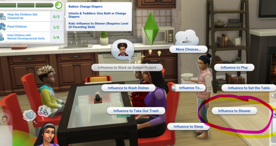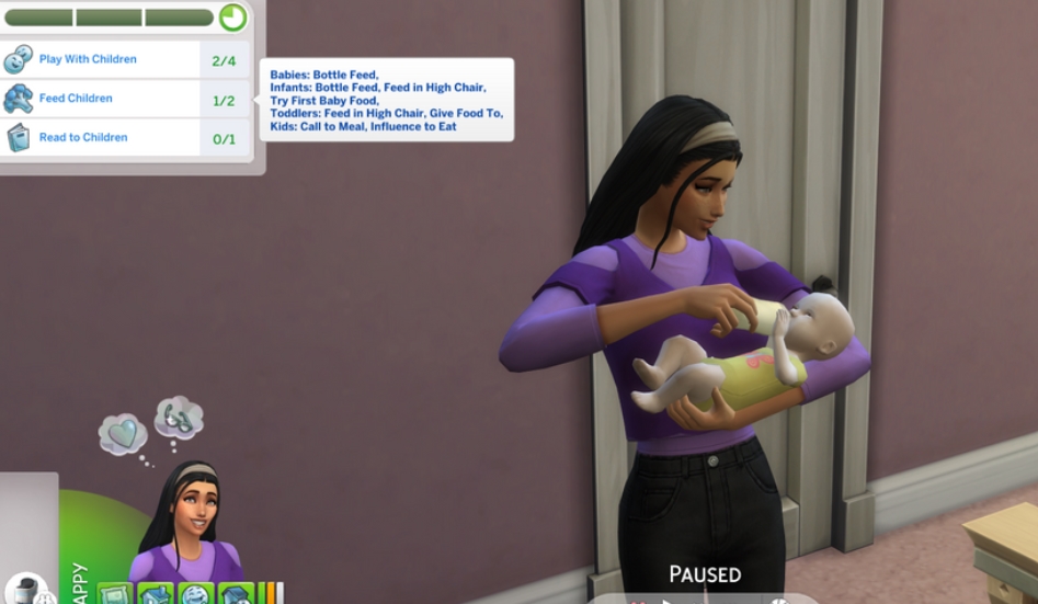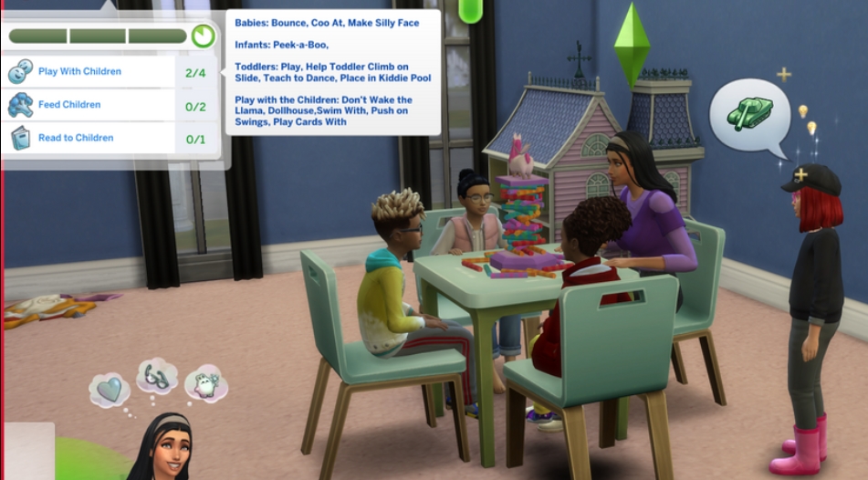 • Симы выполняют задания по уходу за детьми: кормят младенцев, играют с малышами, читают им сказки, развлекают и убирают дом после родителей.