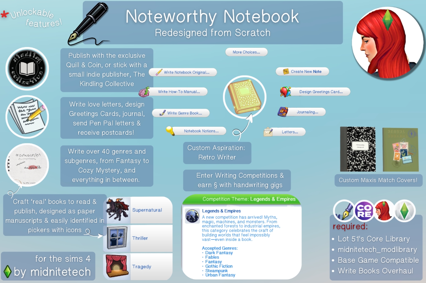 - Расширенные жанры: теперь можно писать не только традиционные книги, но и триллеры, научную фантастику, поэзию и остросюжетные рассказы. - Мини-жанры для Notebook Originals: короткие произведения, которые легко и быстро написать. - Реальные учётные записи: книги можно публиковать, систематизировать и продавать. - Улучшенные учебники: теперь они выглядят более погружёнными с тематическими названиями. - Письма и открытки: симы могут создавать и отправлять карты, письма и коллекционные почтовые открытки. - Конкурсы и задания: новые конкурсы письма с чёткими целями и наградами. - Записи в дневнике: улучшенная система дневников с тематическими заданиями.