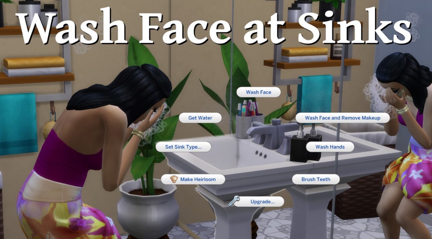 - Добавляет опцию «Умыться» для раковин, позволяя вашим симам поддерживать гигиену, когда нет времени на душ. Макияж при этом не смывается.