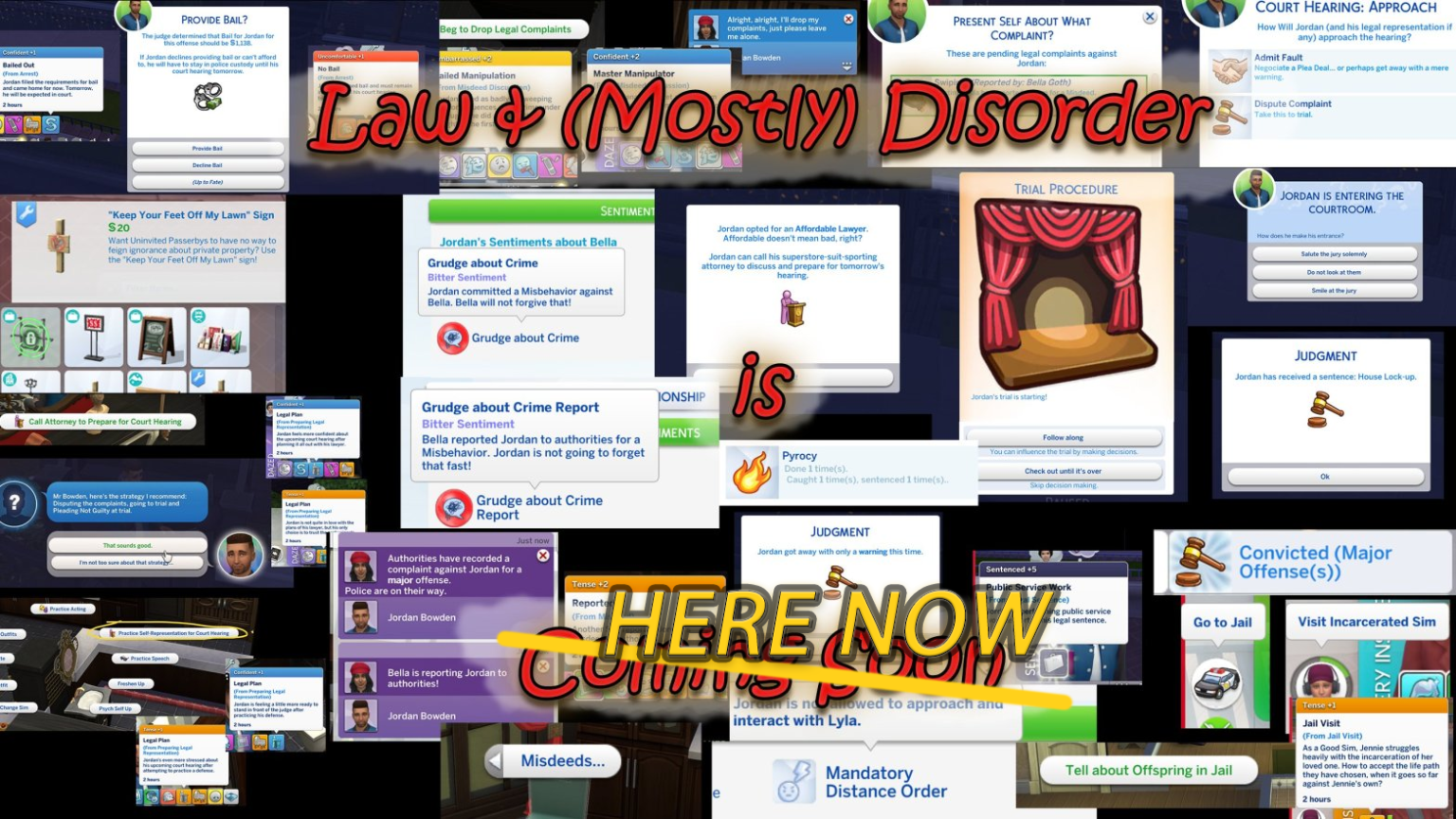 Система включает уведомления о событиях, реакции свидетелей и жертв, а также долгосрочные последствия для жизни симов после суда. Это добавляет глубины и драматизма в игровой процесс.