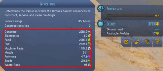 Во всплывающей подсказке «Область обслуживания» теперь можно увидеть список ресурсов, доступных для выбранного вами Drone Hub, Rocket или Rover.